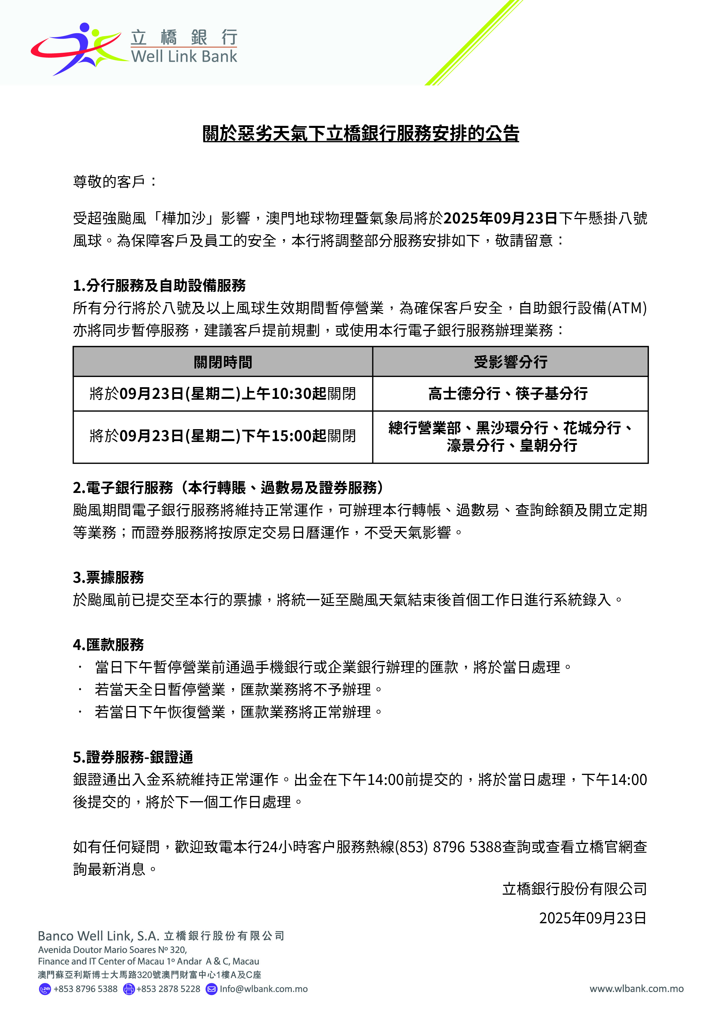 關於惡劣天氣下立橋銀行服務安排的公告