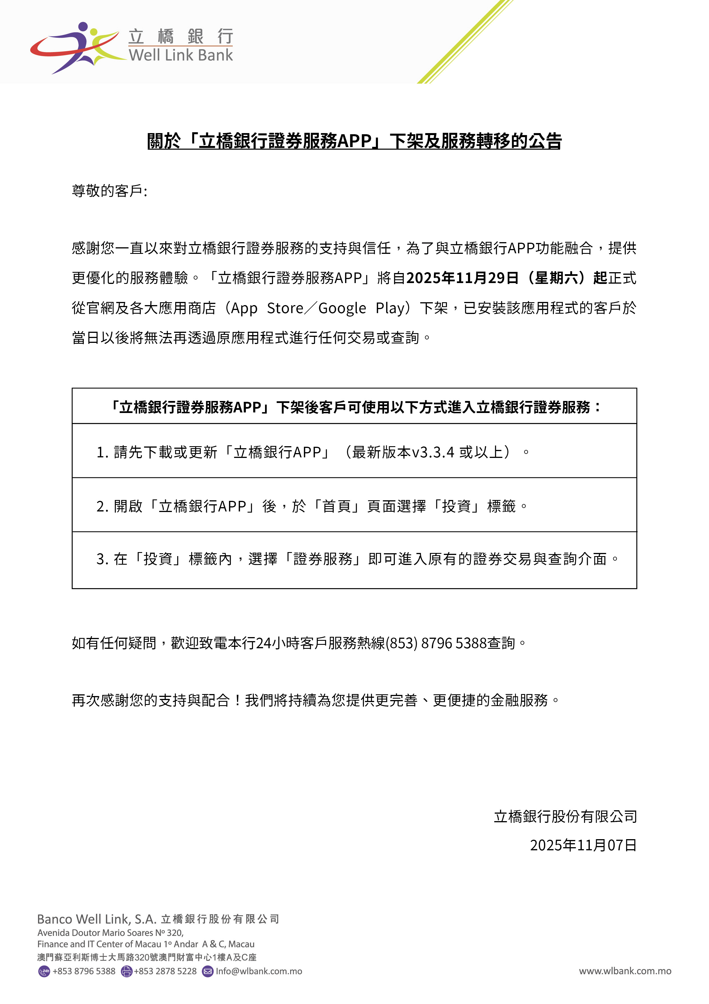 關於「立橋銀行證券服務APP」下架及服務轉移的公告