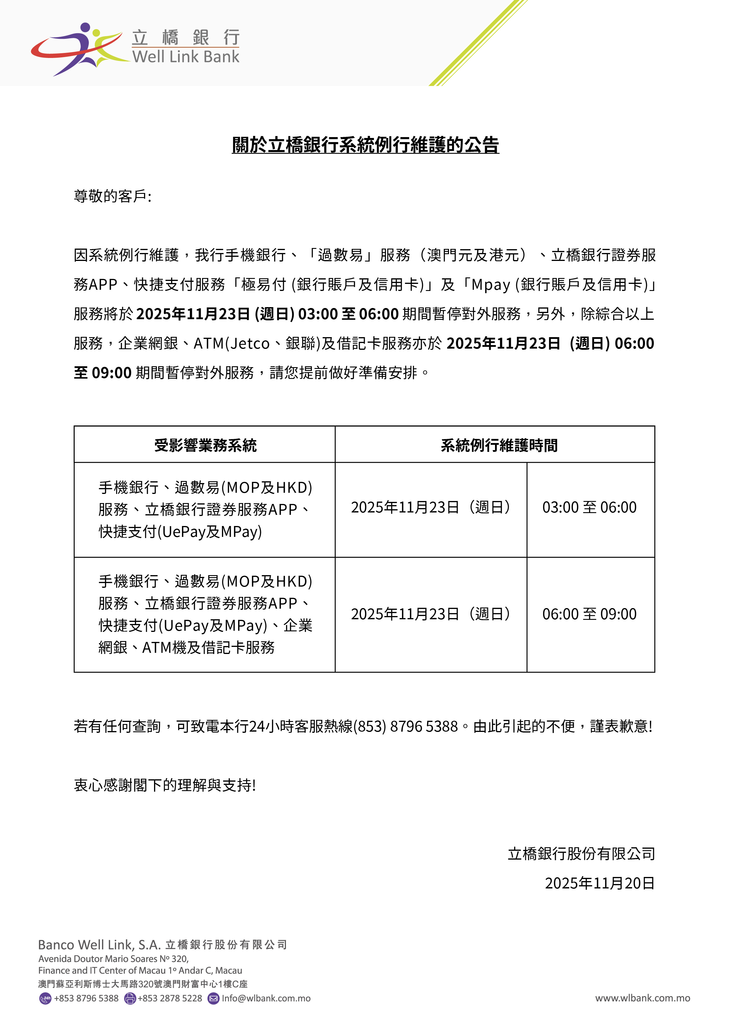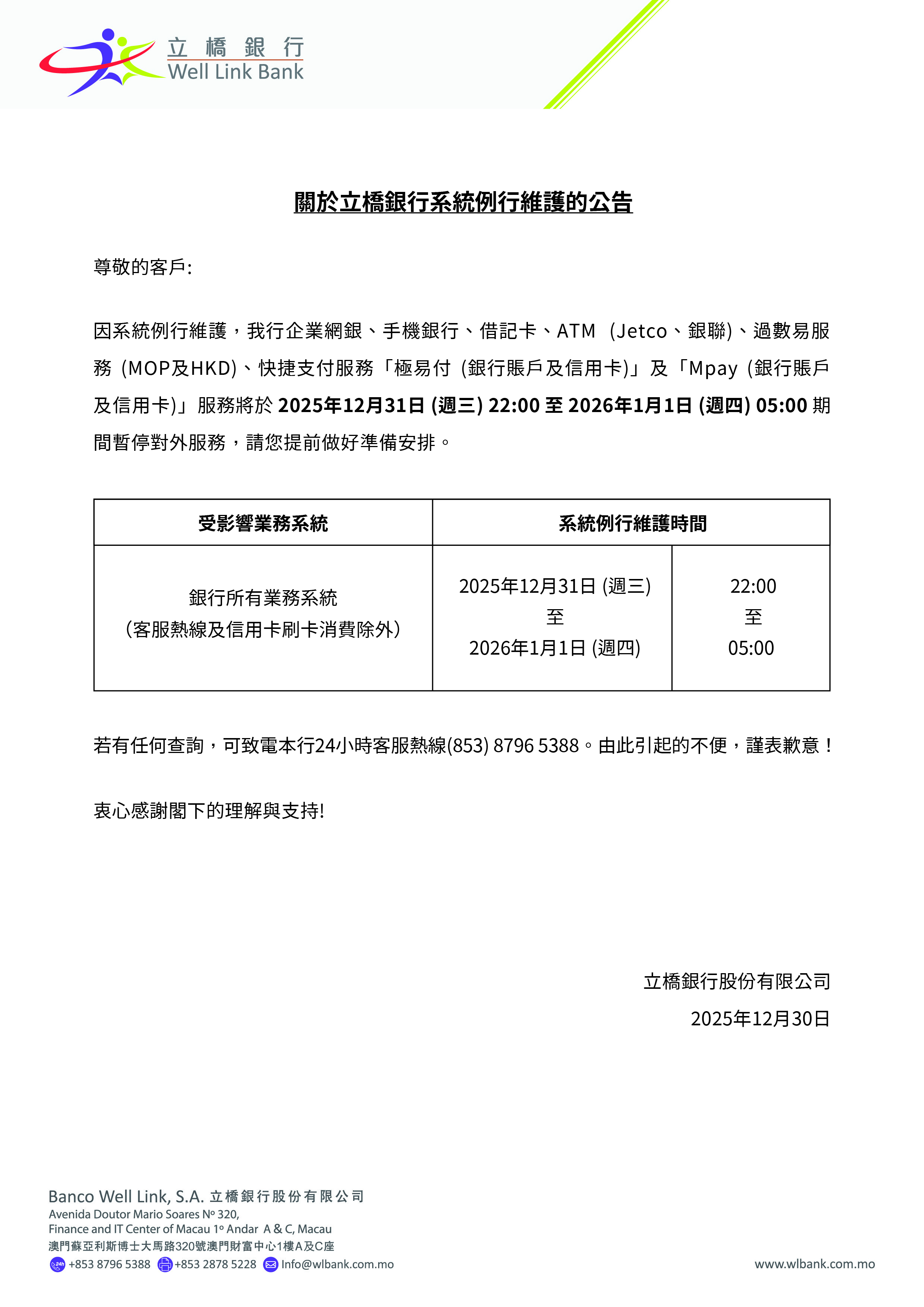 關於立橋銀行系統例行維護的公告