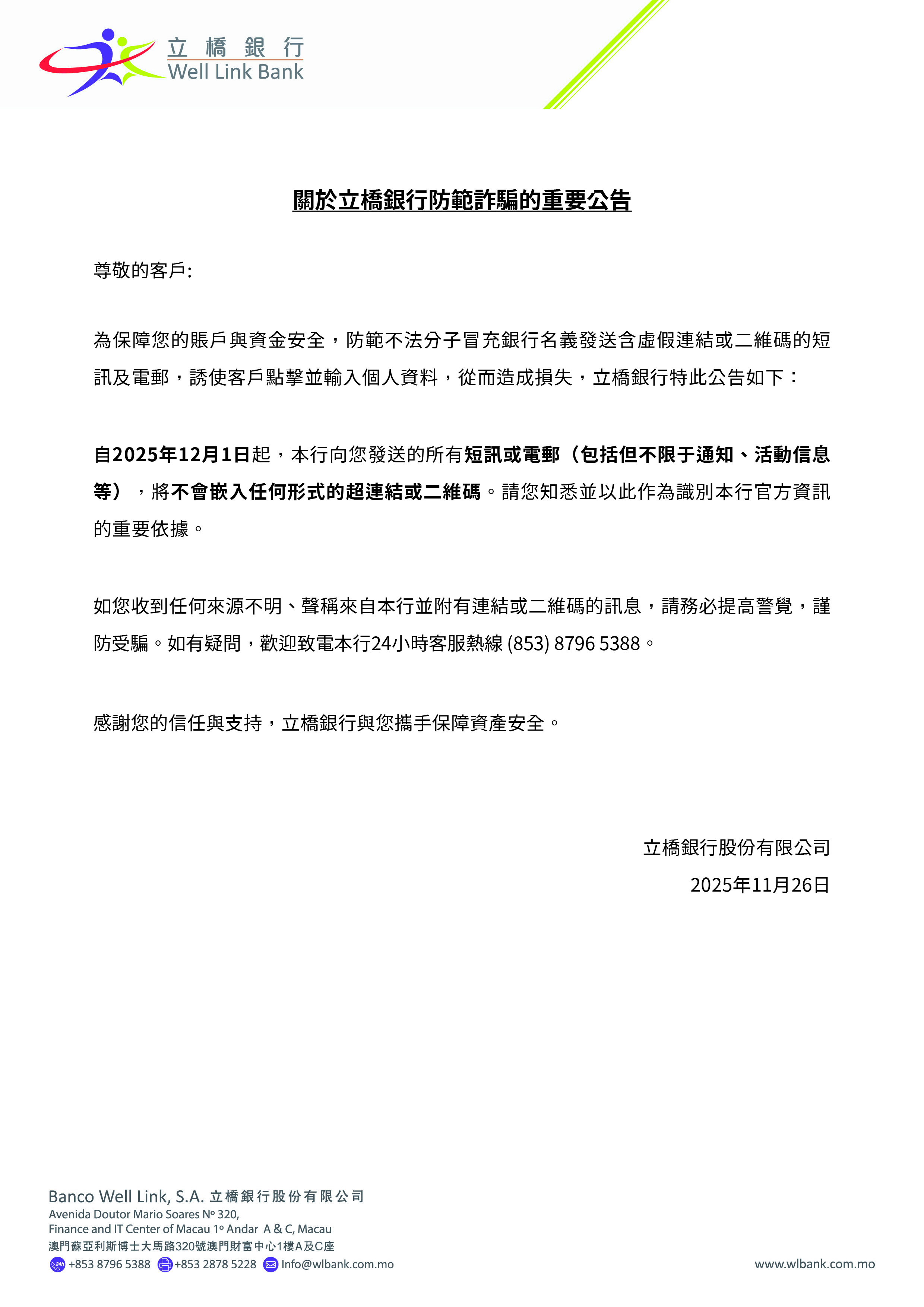 關於立橋銀行防範詐騙的重要公告