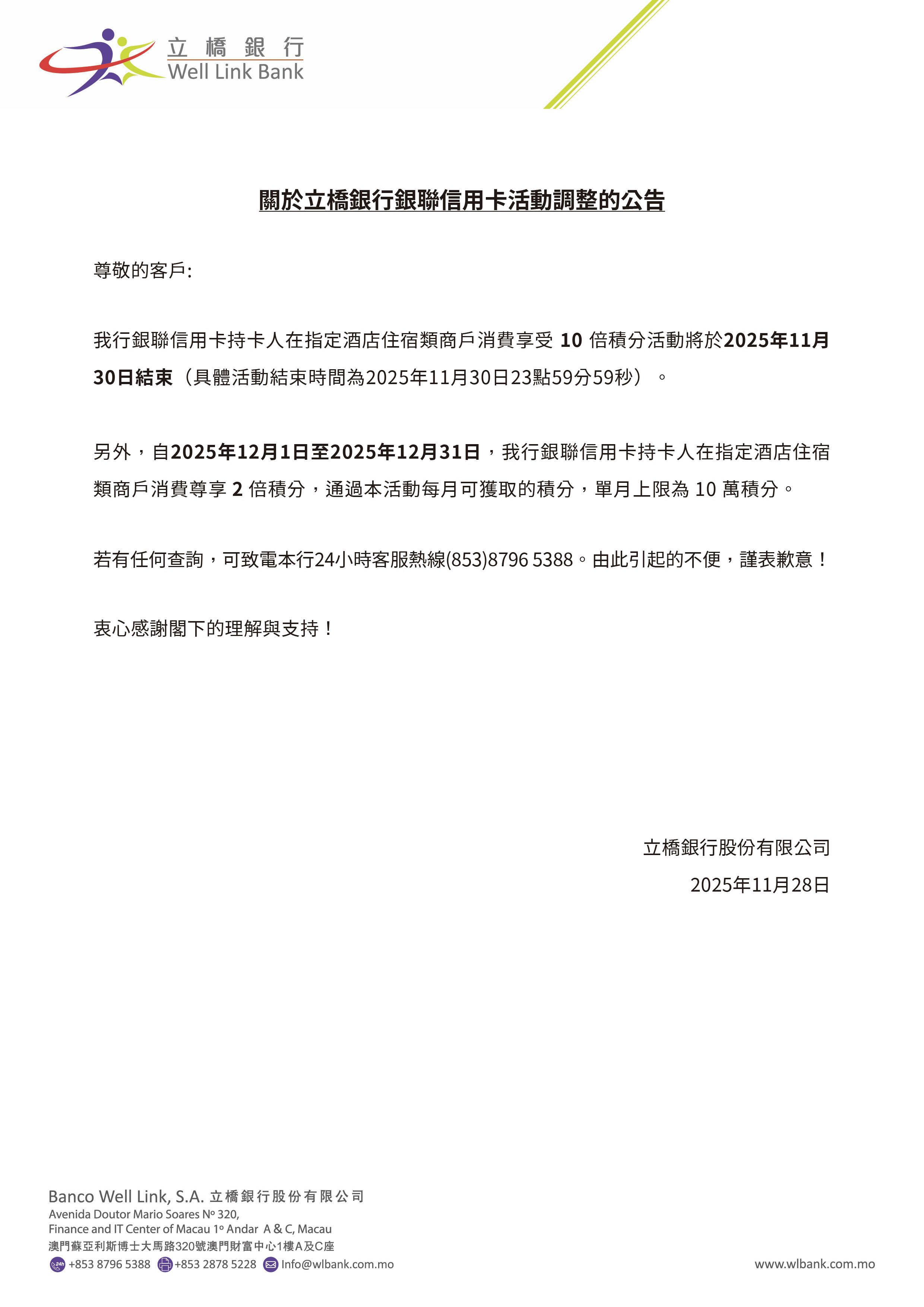 關於立橋銀行銀聯信用卡活動調整的公告