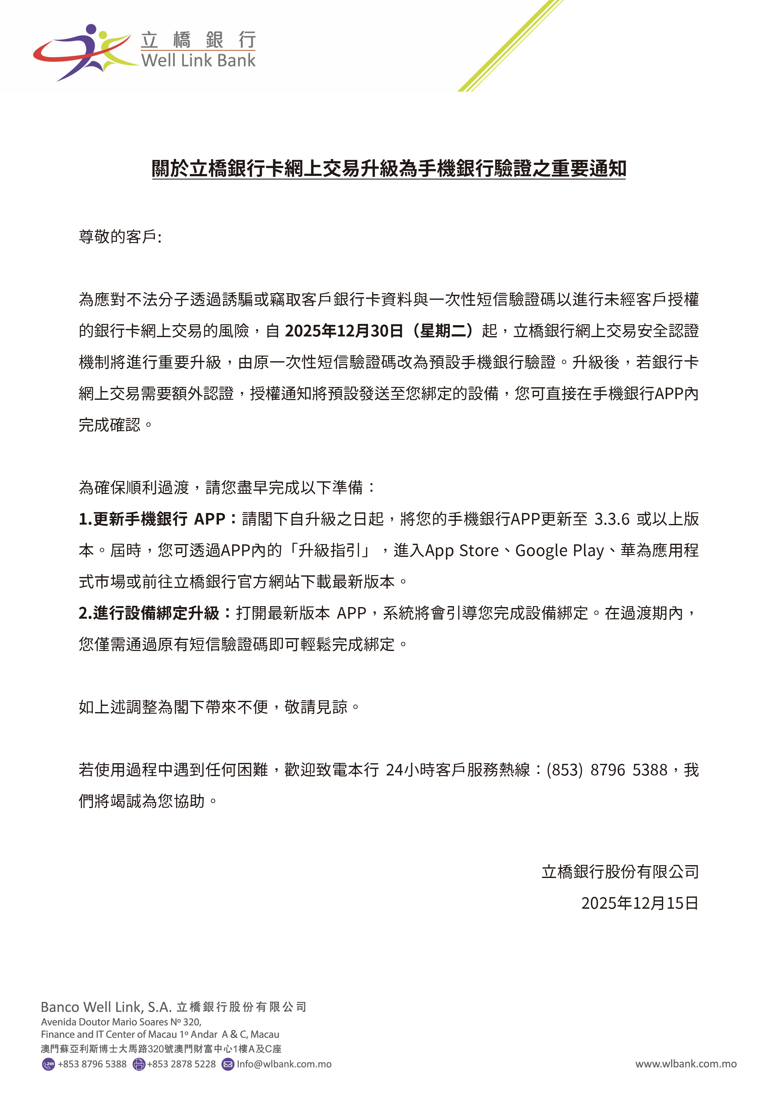 關於立橋銀行網上交易升級為手機銀行驗證之重要通知